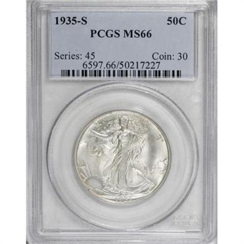 <B>1935-S 50C MS66 PCGS.</B></I> The 1935-S half dollar is not that difficult to locate in the lower grades of Mint State; Gem-quality coins, however, present more of a challenge. The lustrous surfaces of this Premium Gem display whispers of light tan color, and are well preserved, save for a couple of grade-consistent obverse marks. Generally well struck for the issue, including good definition in the gown lines. Population: 89 in 66, 2 finer (11/07).<BR><BR><B>Coin Engraver:</B> Adolph A. Weinman<BR><BR><b>Shipping:</b> Coins & Currency (<a target="_blank" href="http://www.heritageauctions.com/common/shipping.php">view shipping information</a>)