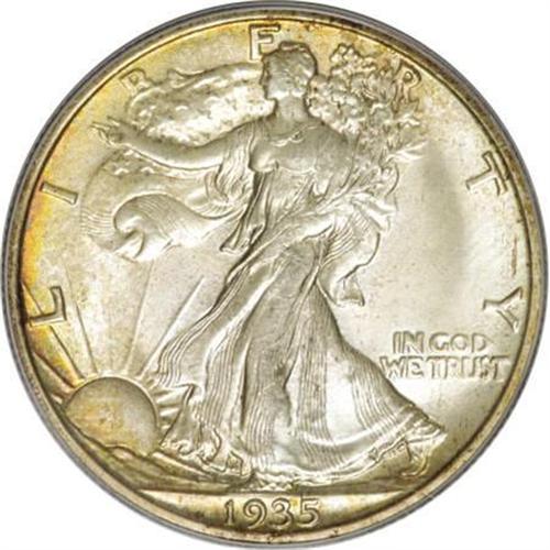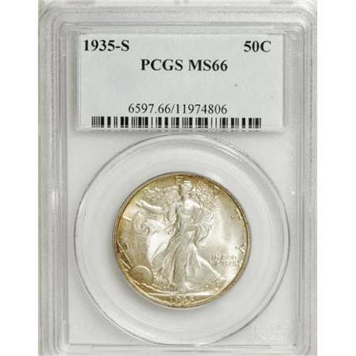 <B>1935-S 50C MS66 PCGS.</B></I> A scarce S-mint half that is often compared to the 1934-S. This piece shows strong striking definition on each side, and softly frosted mint luster. The centers are light silver-gray with a strong accent of golden surrounding the margins on both obverse and reverse. Population: 90 in 66, 2 finer (1/08).<BR><I>From The John Stimson, Sr. Collection, Part Two.</B></I><BR><BR><B>Coin Engraver:</B> Adolph A. Weinman<BR><BR><b>Shipping:</b> Coins & Currency (<a target="_blank" href="http://www.heritageauctions.com/common/shipping.php">view shipping information</a>)