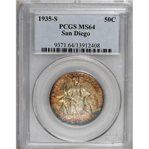 <B>1935-S 50C San Diego MS64 PCGS.</B></I> PCGS Population (2445/7099). NGC Census: (834/3100). Mintage: 70,132. Numismedia Wsl. Price for NGC/PCGS coin in MS64: $124. (#9371)<BR><BR><b>Shipping:</b> Coins & Currency (<a target="_blank" href="http://www.heritageauctions.com/common/shipping.php">view shipping information</a>)