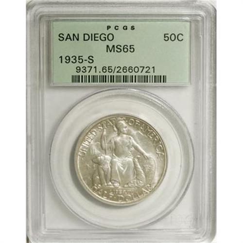 <B>1935-S 50C San Diego MS65 PCGS.</B></I> PCGS Population (5479/1609). NGC Census: (2461/639). Mintage: 70,132. Numismedia Wsl. Price for NGC/PCGS coin in MS65: $140. (#9371)<BR><BR><b>Shipping:</b> Coins & Currency (<a target="_blank" href="http://www.heritageauctions.com/common/shipping.php">view shipping information</a>)