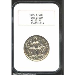 1935-S 50C San Diego MS65 Prooflike NGC.  Glossy and bright, the prooflike surfaces are veiled in delicate golden iridescence. A sharp looking coin with expectantly strong eye appeal for the grade.  Important notice: We expect to be auctioning lots at the rate of 200-250 per hour. Sometimes eBay Premier live bid software cannot keep up with that pace, so we strongly recommend that you place a realistic proxy bid now as insurance to avoid disappointment. Also please note that all Heritage/CAA lots purchased through eBay Premier carry a 20% Buyer's Premium.