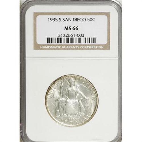 <B>1935-S 50C San Diego MS66 NGC.</B></I> . NGC Census: (569/76). PCGS Population (1509/106). Mintage: 70,132. Numismedia Wsl. Price for NGC/PCGS coin in MS66: $170. (#9371)<BR><BR><b>Shipping:</b> Coins & Currency (<a target="_blank" href="http://www.heritageauctions.com/common/shipping.php">view shipping information</a>)