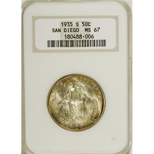 <B>1935-S 50C San Diego MS67 NGC.</B></I> A highly lustrous and boldly impressed Superb Gem. The golden-red patina at the rims greatly enhances the eye appeal. Census: 62 in 67, 4 finer (1/07).<BR><BR><b>Shipping:</b> Coins & Currency (<a target="_blank" href="http://www.heritageauctions.com/common/shipping.php">view shipping information</a>)