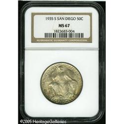 <B>1935-S 50C San Diego MS67 NGC.</B></I> Radiant luster emanates from iridescent low intensity multicolored surfaces that exhibit sharply impressed motifs. Just a few tiny marks are noted in the left obverse field. Lot:8573
