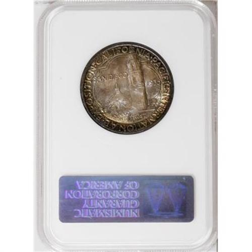 <B>1935-S 50C San Diego MS67 NGC.</B></I> Dusky blue-green and chestnut-gold toning endow this lustrous and lightly abraded example. The strike is precise for this type, which often shows marked weakness along the right border of the observation tower. In a prior generation holder.<BR><I>From The Cary & Cheryl Porter Collection, Part Three.</B></I><BR><BR><b>Shipping:</b> Coins & Currency (<a target="_blank" href="http://www.heritageauctions.com/common/shipping.php">view shipping information</a>\)