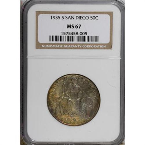 <B>1935-S 50C San Diego MS67 NGC.</B></I> Fully patinated in sea-green, yellow-gold, violet-red, and dove-gray. This satiny Superb Gem is crisply struck and nearly void of marks. A find for the connoisseur of lavishly toned silver commemoratives.<BR><BR><b>Shipping:</b> Coins & Currency (<a target="_blank" href="http://www.heritageauctions.com/common/shipping.php">view shipping information</a>)