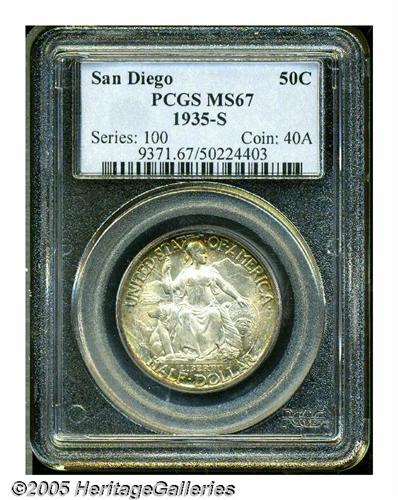 <B>1935-S<50C> San Diego MS67 PCGS.</B></I> Supremely well preserved light violet surfaces with rainbow colored peripheries. Nicely detailed strike, with expectedly few imperfections. As of (6/05), only 7 coins have been graded higher by either of the major services.
