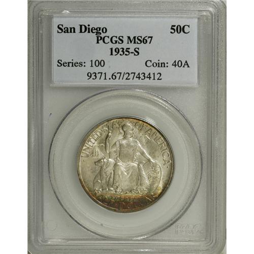 <B>1935-S 50C San Diego MS67 PCGS.</B></I> There is an arc of deep purple-red and green colors near the lower obverse rim, with small amounts of dappled and peripheral toning elsewhere. The well struck surfaces are satiny and virtually pristine. A marvelous Superb Gem, of exceptional quality for this otherwise common issue. Population: 97 in 67, 3 finer (12/06).<BR><BR><b>Shipping:</b> Coins & Currency (<a target="_blank" href="http://www.heritageauctions.com/common/shipping.php">view shipping information</a>)