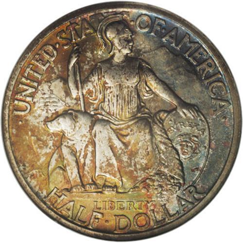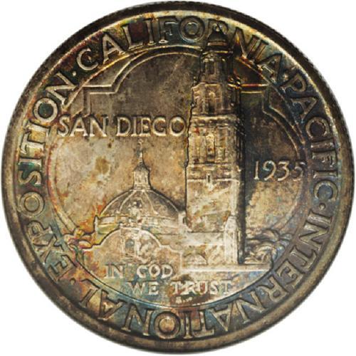 <B>1935-S 50C San Diego MS68 <img border='0' src='http://www.heritagecoins.com/images/star.gif' width=10 height=10> NGC.</B></I> Though San Francisco coined the entire authorized mintage of 250,000 San Diego halves plus assay examples, nearly 180,000 1935-S coins were melted as unsold and recoined at the Denver Mint as 1936-D pieces. Waves of copper-orange, lime-green, and steel-blue toning wash over the highly lustrous surfaces, and a few small areas of the reverse display a hint of near-brilliance. While NGC has graded four coins as MS68, this is the only one awarded the Star designation, with none finer (4/07).<BR><I>From The Cary & Cheryl Porter Collection.</B></I><BR><BR><b>Shipping:</b> Coins & Currency (<a target="_blank" href="http://www.heritageauctions.com/common/shipping.php">view shipping information</a>)