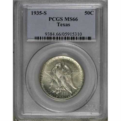 <B>1935-S 50C Texas MS66 PCGS.</B></I> PCGS Population (323/98). NGC Census: (419/104). Mintage: 10,000. Numismedia Wsl. Price for NGC/PCGS coin in MS66: $380. (#9384)<BR><BR><b>Shipping:</b> Coins & Currency (<a target="_blank" href="http://www.heritageauctions.com/common/shipping.php">view shipping information</a>)