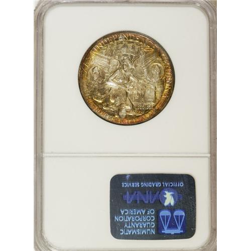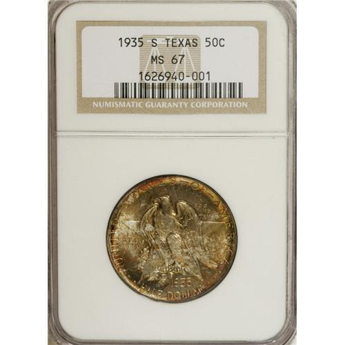 <B>1935-S 50C Texas MS67 NGC.</B></I> In an interesting departure from the norm, Pompeo Coppini placed an eagle, historically a reverse design element, prominently on the obverse. The shining surfaces of this terrific piece display a striking blend of copper-gold, yellow, and mint-green patina with sections of silver-gray in the center. NGC has graded only two examples in MS68 (4/07).<BR><I>From The Cary & Cheryl Porter Collection.</B></I><BR><BR><b>Shipping:</b> Coins & Currency (<a target="_blank" href="http://www.heritageauctions.com/common/shipping.php">view shipping information</a>)
