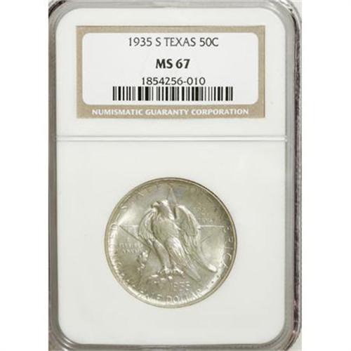 <B>1935-S 50C Texas MS67 NGC.</B></I> NGC Census: (99/2). PCGS Population (87/1). Mintage: 10,000. Numismedia Wsl. Price for NGC/PCGS coin in MS67: $1,085. (#9384)<BR><I>From The Frank DuVall Collection of U.S. Commemoratives.</B></I><BR><BR><b>Shipping:</b> Coins & Currency (<a target="_blank" href="http://www.heritageauctions.com/common/shipping.php">view shipping information</a>\)