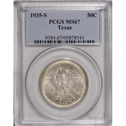 <B>1935-S 50C Texas MS67 PCGS.</B></I> Silver-gray centers with a touch of gold-orange patina at the margins. This well-defined and luminous Superb Gem offers excellent eye appeal for an S-mint commemorative. PCGS has graded only one finer example (1/08).<BR><BR><b>Shipping:</b> Coins & Currency (<a target="_blank" href="http://www.heritageauctions.com/common/shipping.php">view shipping information</a>)
