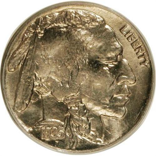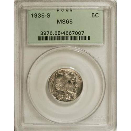 <B>1935-S 5C MS65 PCGS.</B></I> PCGS Population (827/348). NGC Census: (401/131). Mintage: 10,300,000. Numismedia Wsl. Price for NGC/PCGS coin in MS65: $180. (#3976)<BR><BR><b>Shipping:</b> Coins & Currency (<a target="_blank" href="http://www.heritageauctions.com/common/shipping.php">view shipping information</a>)