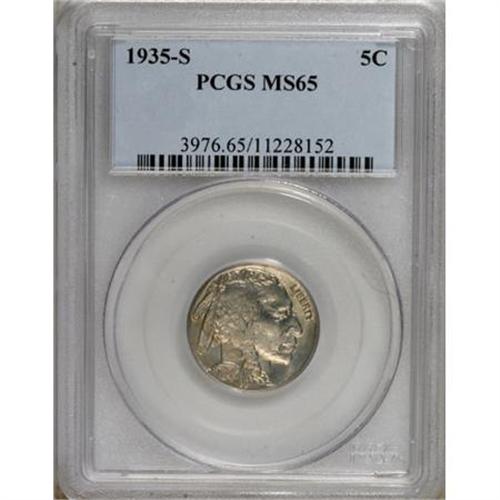 <B>1935-S 5C MS65 PCGS.</B></I> PCGS Population (856/352). NGC Census: (403/132). Mintage: 10,300,000. Numismedia Wsl. Price for NGC/PCGS coin in MS65: $172. (#3976)<BR><BR><B>Coin Engraver:</B> James E. Fraser<BR><BR><b>Shipping:</b> Coins & Currency (<a target="_blank" href="http://www.heritageauctions.com/common/shipping.php">view shipping information</a>\)