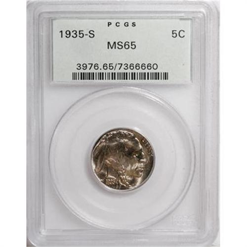 <B>1935-S 5C MS65 PCGS.</B></I> PCGS Population (881/370). NGC Census: (407/135). Mintage: 10,300,000. Numismedia Wsl. Price for NGC/PCGS coin in MS65: $172. (#3976)<BR><BR><B>Coin Engraver:</B> James E. Fraser<BR><BR><b>Shipping:</b> Coins & Currency (<a target="_blank" href="http://www.heritageauctions.com/common/shipping.php">view shipping information</a>)
