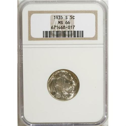 <B>1935-S 5C MS66 NGC.</B></I> NGC Census: (120/12). PCGS Population (325/27). Mintage: 10,300,000. Numismedia Wsl. Price for NGC/PCGS coin in MS66: $415. (#3976)<BR><BR><B>Coin Engraver:</B> James E. Fraser<BR><BR><b>Shipping:</b> Coins & Currency (<a target="_blank" href="http://www.heritageauctions.com/common/shipping.php">view shipping information</a>\)