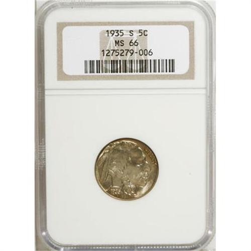 <B>1935-S 5C MS66 NGC.</B></I> NGC Census: (120/12). PCGS Population (325/27). Mintage: 10,300,000. Numismedia Wsl. Price for NGC/PCGS coin in MS66: $415. (#3976)<BR><BR><B>Coin Engraver:</B> James E. Fraser<BR><BR><b>Shipping:</b> Coins & Currency (<a target="_blank" href="http://www.heritageauctions.com/common/shipping.php">view shipping information</a>\)
