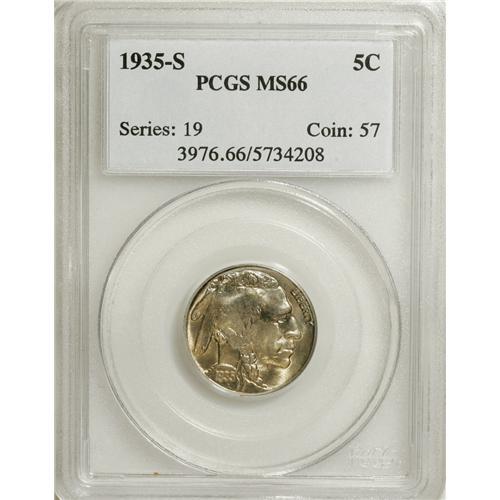 <B>1935-S 5C MS66 PCGS.</B></I> PCGS Population (321/27). NGC Census: (230/24). Mintage: 10,300,000. Numismedia Wsl. Price for NGC/PCGS coin in MS66: $415. (#3976)<BR><BR><b>Shipping:</b> Coins & Currency (<a target="_blank" href="http://www.heritageauctions.com/common/shipping.php">view shipping information</a>)