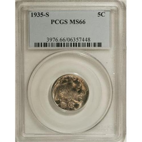 <B>1935-S 5C MS66 PCGS.</B></I> PCGS Population (321/27). NGC Census: (119/12). Mintage: 10,300,000. Numismedia Wsl. Price for NGC/PCGS coin in MS66: $415. (#3976)<BR><BR><b>Shipping:</b> Coins & Currency (<a target="_blank" href="http://www.heritageauctions.com/common/shipping.php">view shipping information</a>)