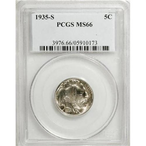 <B>1935-S 5C MS66 PCGS.</B></I> PCGS Population (346/27). NGC Census: (124/12). Mintage: 10,300,000. Numismedia Wsl. Price for NGC/PCGS coin in MS66: $415. (#3976)<BR><BR><B>Coin Engraver:</B> James E. Fraser<BR><BR><b>Shipping:</b> Coins & Currency (<a target="_blank" href="http://www.heritageauctions.com/common/shipping.php">view shipping information</a>)