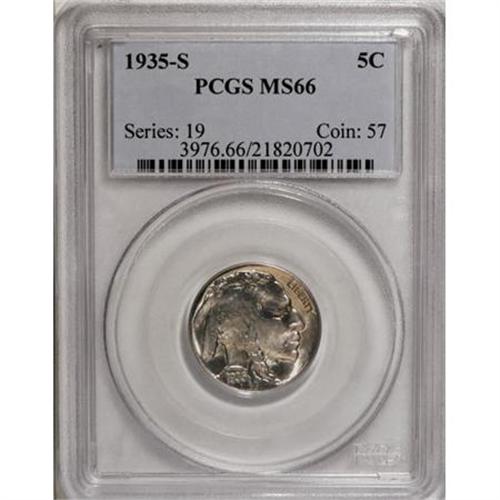 <B>1935-S 5C MS66 PCGS.</B></I> . PCGS Population (348/27). NGC Census: (124/12). Mintage: 10,300,000. Numismedia Wsl. Price for NGC/PCGS coin in MS66: $400. (#3976)<BR><BR><B>Coin Engraver:</B> James E. Fraser<BR><BR><b>Shipping:</b> Coins & Currency (<a target="_blank" href="http://www.heritageauctions.com/common/shipping.php">view shipping information</a>)