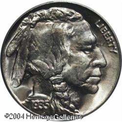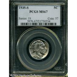 1935-S 5C MS67 PCGS. In addition to this Superb Ge <B>1935-S 5C MS67 PCGS.</B></I> In addition to this Superb Gem's vibrant luster and lovely pastel toning, the central devices offer far better sharpness than is most often found on Mint State examples. One tiny mark is seen at the rear portion of the Indian's cheek. Population: 22 in 67, 0 finer (11/04). <BR><BR><B>Important notice:</B> Heritage usually auctions material at the rate of 200-250 lots per hour. On some occasions eBay Live bid software or the Internet may not be able to keep up with the pace of the auction. We recommend placing a realistic absentee bid now as insurance to avoid disappointment. Occasionally the auctioneer may eliminate or reject an eBay Live bid, and the auctioneer may also reopen a lot after the close of the eBay live bidding (usually because we missed an audience bid), and may reject your bid even if it shows you as the winning bidder. By bidding via eBay Live, you agree that Heritage may award the lot to another bidder at its sole discretion under the circumstances described above or any other reasonable circumstances. Since eBay bids are not shown to us until we open the lot on the floor, we treat those bids just like floor bids. In most cases the floor responds before the eBay bid is presented to us, due to Internet lag time, so for consistency we have made it a policy that floor bids are always considered first over tie eBay live bids. Also please note that all Heritage lots purchased through eBay Live carry a 20% Buyer's Premium. Please make sure you read the Terms and Conditions before you bid. This lot is being auctioned in conjunction with a live floor auction by Heritage Galleries & Auctioneers. All final auction and invoice information will be supplied by Heritage Galleries & Auctioneers, and all other information should be considered preliminary. Lot:5605