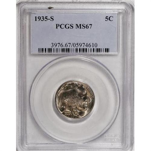 <B>1935-S 5C MS67 PCGS.</B></I> While most examples of this issue illustrate the effects of a weak strike, this example is boldly impressed, with nearly full details. The only area capable of improvement is the central portion of the obverse. The luster is incredible, and the color is a pleasing golden-blue. The surfaces are extremely clean and the eye appeal is tremendous. Neither PCGS nor NGC have graded an example finer than this one (12/07). <BR><BR><B>Coin Engraver:</B> James E. Fraser<BR><BR><b>Shipping:</b> Coins & Currency (<a target="_blank" href="http://www.heritageauctions.com/common/shipping.php">view shipping information</a>)