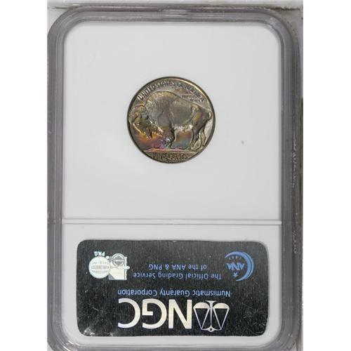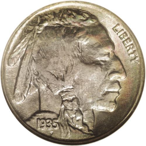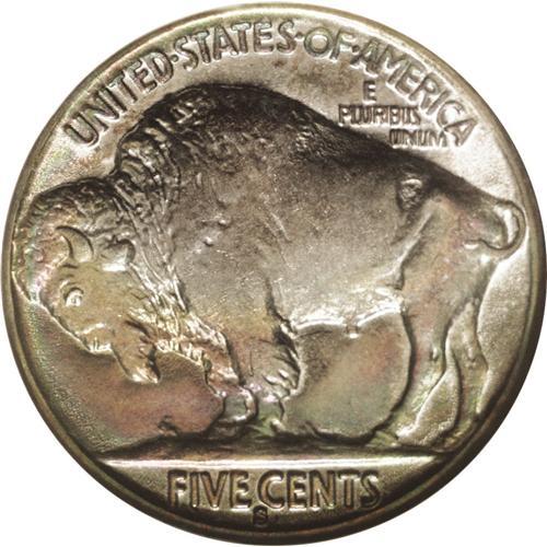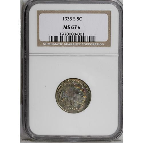 <B>1935-S<5C> MS67 <img border='0' src='http://www.heritagecoins.com/images/star.gif' width=10 height=10> NGC.</B></I> Most examples of this issue are not sharply impressed. The Superb Gem presented here, however, is a notable exception, as crisp definition is apparent on all of the design elements. It is this attribute, along with potent luster and waves of vivid lime-green, sky-blue, yellow-gold, crimson, and powder-blue patination, that helps to account for the coveted Star designation. Careful scrutiny with a glass does not reveal any mentionable contact marks. A small unobtrusive fleck located near the reverse rim at 5 o'clock is mentioned for accuracy. Census: 3 in 67 <img border='0' src='http://www.heritagecoins.com/images/star.gif' width=10 height=10>, 0 finer (6/06).