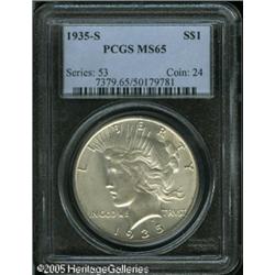 <B>1935-S<img border='0' src='http://www.heritagecoins.com/images/star.gif' width=10 height=10>$1 MS65 PCGS.</B></I> This is a satiny Gem with brilliant silver surfaces and excellent luster. Just a couple tiny bagmarks shy of an even higher grade. Lot:10754
