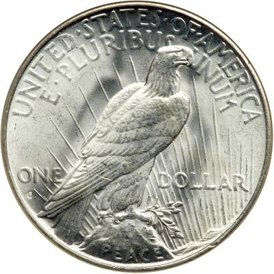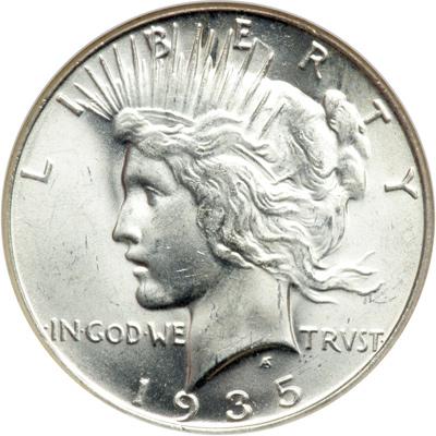 1935-S Peace Dollar. NGC graded MS-65. A fully white coin. This is a beautiful Gem Peace dollar irrespective of date and issuing Mint. Both sides display beaming white luster with a frosty sheen that gleams rhythmically across the surface. The few minute abrasions are well spaced and do not intrude, while the strike impresses us as being sharp throughout. A strong candidate to represent the 1935-S in a high-quality date and mint set of this popular silver dollar Type.