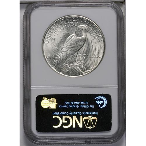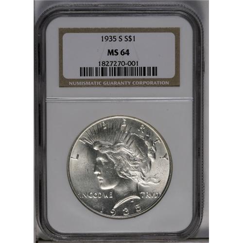 <B>1935-S<img border='0' src='http://www.heritagecoins.com/images/star.gif' width=10 height=10>$1> MS64 NGC.</B></I> Three rays beneath ONE. This nearly brilliant near-Gem has clean surfaces and unbroken cartwheel sheen. A sharply struck and attractive example of this final-year San Francisco issue.