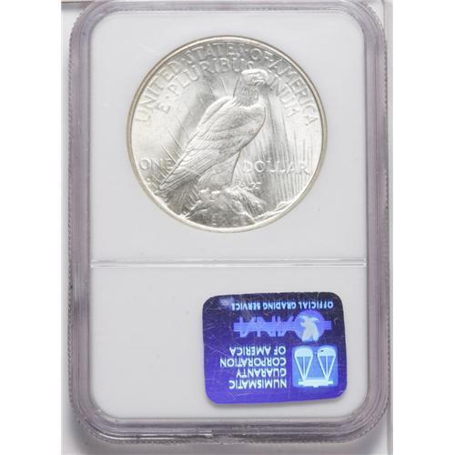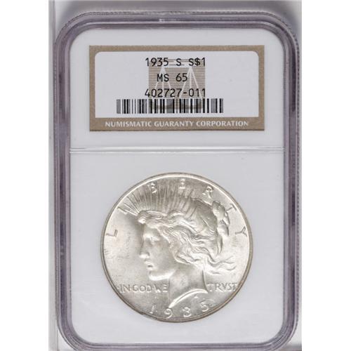 <B>1935-S<img border='0' src='http://www.heritagecoins.com/images/star.gif' width=10 height=10>$1> MS65 NGC.</B></I> Four rays beneath ONE. Light golden patina visits this lustrous and crisply impressed Gem. The reverse is particularly smooth. A pair of curly, interesting lint marks are noted east of the date.