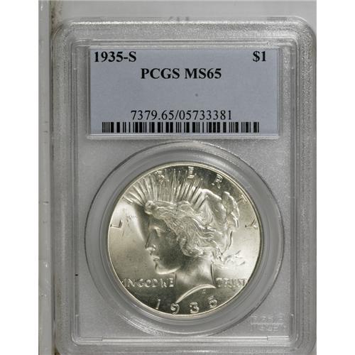 <B>1935-S S$1 MS65 PCGS.</B></I> A frosty Gem that has above-average detail and a near-absence of toning. Minor luster grazes on the chin and neck have negligible impact on the overall eye appeal.<BR><BR><b>Shipping:</b> Coin/Currency (<a target="_blank" href="http://www.heritageauctions.com/common/shipping.php">view shipping information</a>)