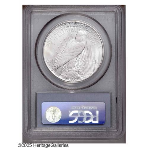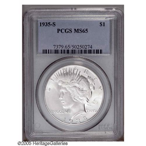 <B>1935-S<S$1> MS65 PCGS.</B></I> Three rays below ONE. Gorgeous blast white last year of issue of Peace dollar. The fields are lustrous with a full strike and a minimum of marks.
