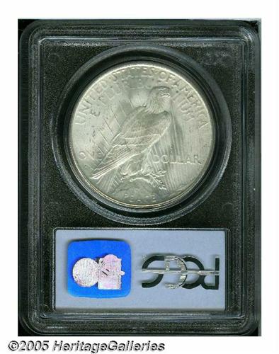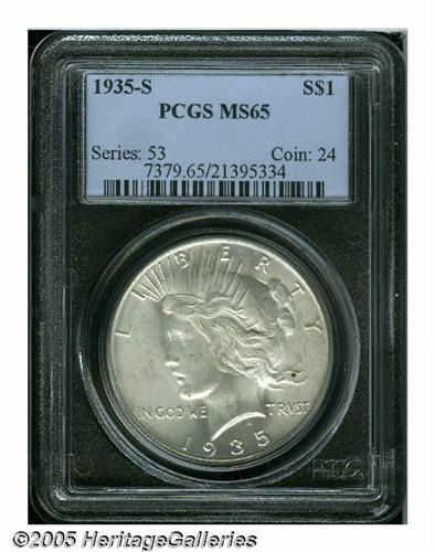 <B>1935-S<S$1> MS65 PCGS.</B></I> Three rays beneath ONE. Booming luster and a good strike affirm the quality of this lightly toned and carefully preserved tan-gray Gem.