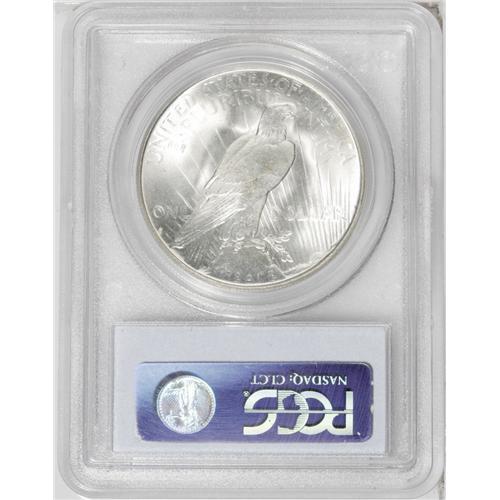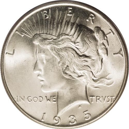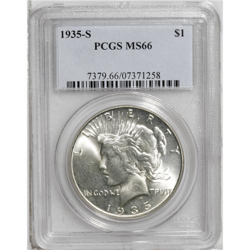 <B>1935-S<img border='0' src='http://www.heritagecoins.com/images/star.gif' width=10 height=10>$1> MS66 PCGS.</B></I> This is a frosty and fully brilliant Gem with exceptional silver-white surfaces. The 1935 Peace dollars, both Philadelphia and San Francisco Mint examples, represent the final year of issue for this design, although rumors of a 1964 Peace dollar have been repeated by numismatists for many years. Just two superior examples of this date have been certified by PCGS (8/06).