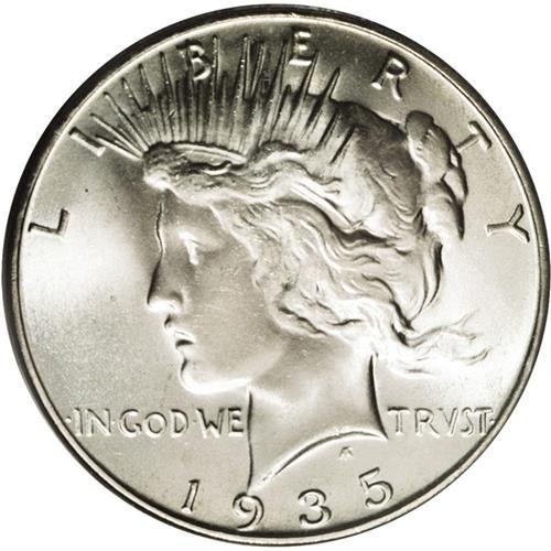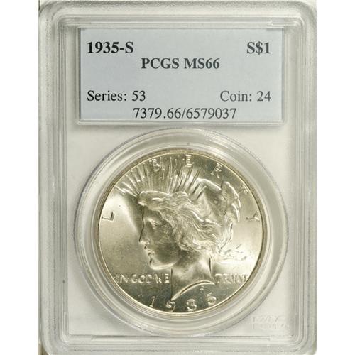 <B>1935-S S$1 MS66 PCGS.</B></I> Three rays below ONE. Dashes of sun-gold toning adorn this dazzling Premium Gem, which has thick mint frost and an above average strike. The reverse is particularly free from marks. As of (1/07), PCGS and NGC combined have certified just four pieces finer.<BR><BR><b>Shipping:</b> Coins & Currency (<a target="_blank" href="http://www.heritageauctions.com/common/shipping.php">view shipping information</a>)