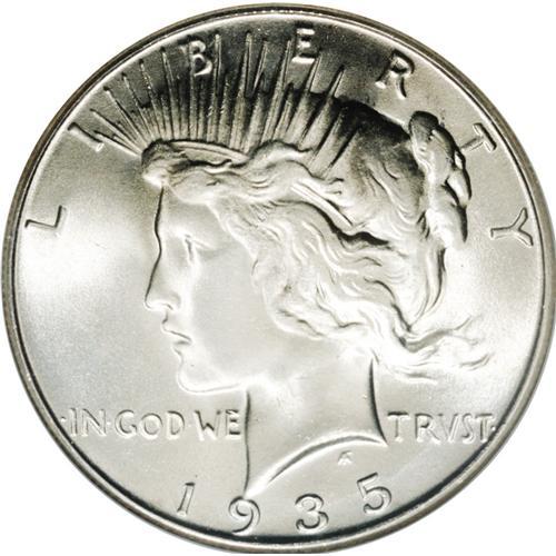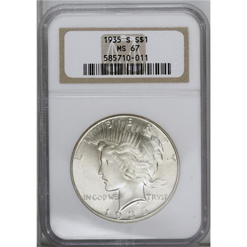 <B>1935-S<img border='0' src='http://www.heritagecoins.com/images/star.gif' width=10 height=10>$1> MS67 NGC.</B></I> Four rays beneath ONE, thought by some to be the scarcer of the two subtypes for the issue. The San Francisco Mint, along with the Philadelphia facility, produced the final Peace dollars in 1935. The total mintage for the '35-S is a relatively modest 1.9 million pieces. Nevertheless, this issue is readily obtainable in all grades through the MS64 level, and even MS65 coins can be located with a little patience. In finer grades, the '35-S is rare, and neither service has yet to certify a coin above the present level.<BR> This is a beautifully frosted, bright, essentially untoned, snow-white example. While S-mint Peace dollars are typically characterized by poor striking quality, this coin is boldly, if not sharply struck in all areas. There are few abrasions, none of which are sizeable, and virtually none of which are located in the prime focal areas. Simply put, this is a beautiful coin and one of the most important '35-S Peace Dollars that we have ever offered. Census: 2 in 67, 0 finer (2/06).<BR><I>From The Robert Moreno Registry Collection of Peace Dollars.</B></I>
