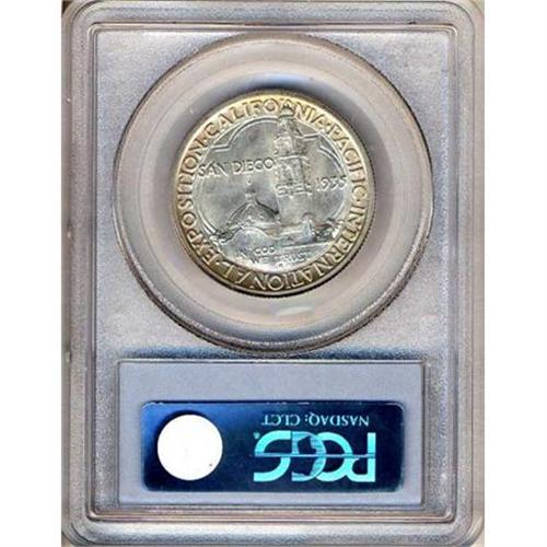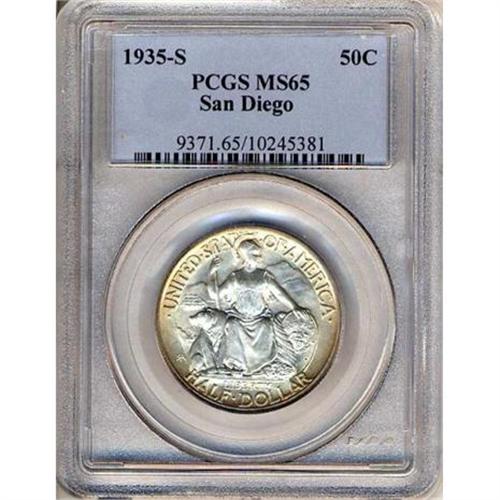 <b>1935-S San Diego Half Dollar. PCGS graded MS65.</b> The frosty white color is especially vibrant on the surface, with golden toning just starting to show at the rim. A gem <b>(PCGS # 9371)</b> <i>