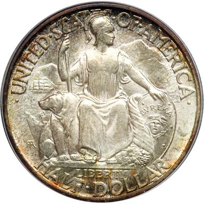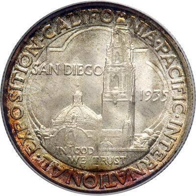 1935-S San Diego Half Dollar. PCGS graded MS-67. Lovely rainbow toning around the edges. Shimmering luster that glitters and swims in "cartwheel" fashion beneath the color. What a stunning combination. Pop 104; 3 finer. (PCGS # 9371).
