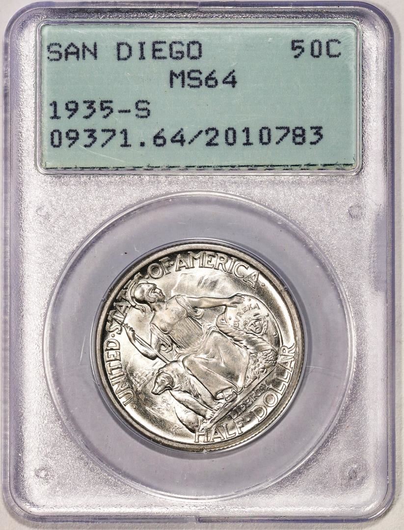 One 1935-S San Diego Exposition Commemorative Half Dollar Coin PCGS MS64 Rattler Holder. PCGS Graded.