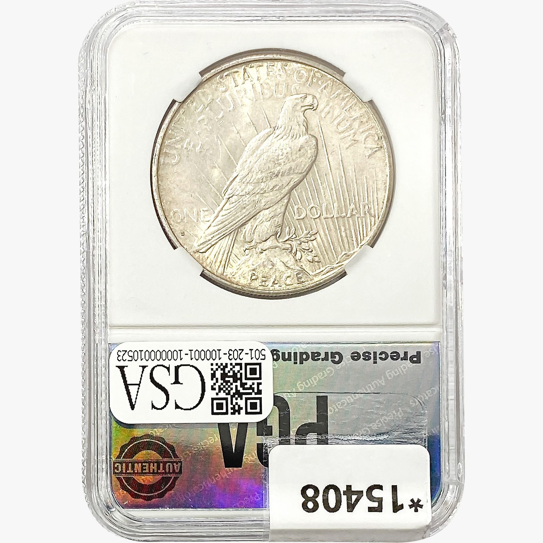 l. All non-certified coins and currency are guaranteed genuine, but are not guaranteed as to grade, since grading is a matter of opinion, an art and not a science, and therefore the description rendered by GSA or any third-party grading service may not agree with the opinion of others (including trained experts), and the same expert may not grade the same item with the same grade at two different times. GSA may, but is not obligated to, express an opinion as to non-certified numismatic items, in GSA’s opinion, or by its employees’ experience and the current interpretation of the American Numismatic Association’s standards as of the date the catalog was prepared. There is no guarantee or warranty expressed or implied that the grading opinions utilized by GSA, if any, will meet the standards of any grading service at any time in the future.