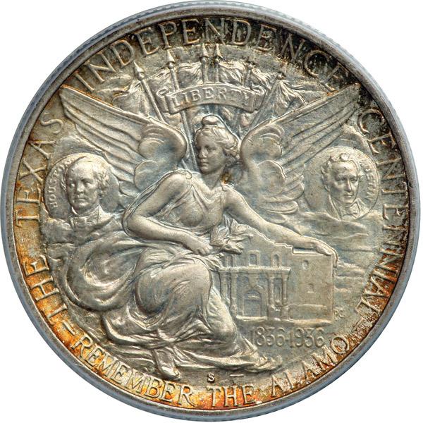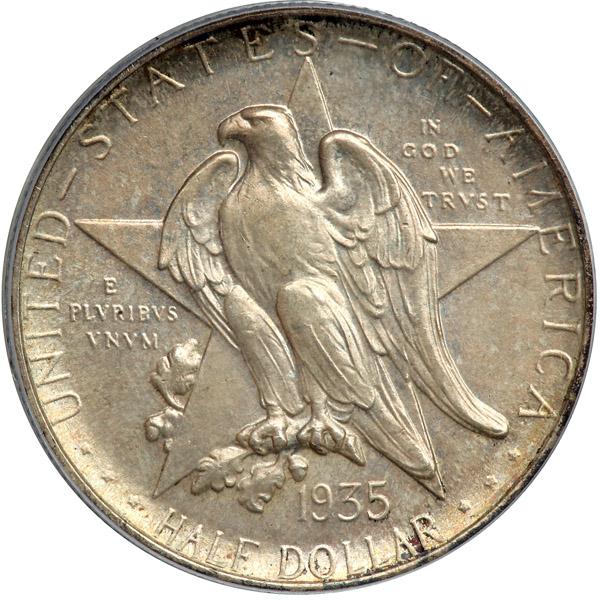 1935-S Texas Half Dollar. PCGS graded MS-65. Nicely toned with delicate shades of gold. Stored for over 60 years in a Wayte Raymond folder (PCGS # 9384) .