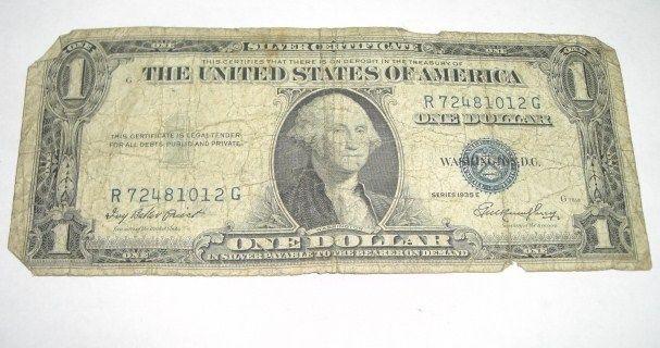 1935 SERIES E $1 SILVER CERTIFICATE NOTE SERIAL # R72481012G!! BILL CAME OUT OF SAFE BOX!! ***Coin, Currency & All Items Listed in this auction - Grades, Conditions and Values are not Safe Deposit Coins LLC Responsibilty. Grades, Condition and Values are determined by Consigner(s) & Buyers ONLY