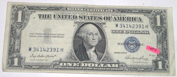 1935 SERIES E $1 SILVER CERTIFICATE SERIAL # W34142391 *RARE VERY FINE VERY EARLY NOTE*!! BILL CAME OUT OF SAFE BOX!! ***Coin, Currency & All Items Listed in this auction - Grades, Conditions and Values are not Safe Deposit Coins LLC Responsibilty. Grades, Condition and Values are determined by Consigner(s) & Buyers ONLY