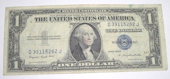 1935 SERIES G SILVER CERTIFICATE $1 SERIAL # D39115262J *NICE BILL PLEASE LOOK AT PICTURE TO DETERMINE GRADE*!! ***Coin, Currency & All Items Listed in this auction - Grades, Conditions and Values are not Safe Deposit Coins LLC Responsibilty. Grades, Condition and Values are determined by Consigner(s) & Buyers ONLY***