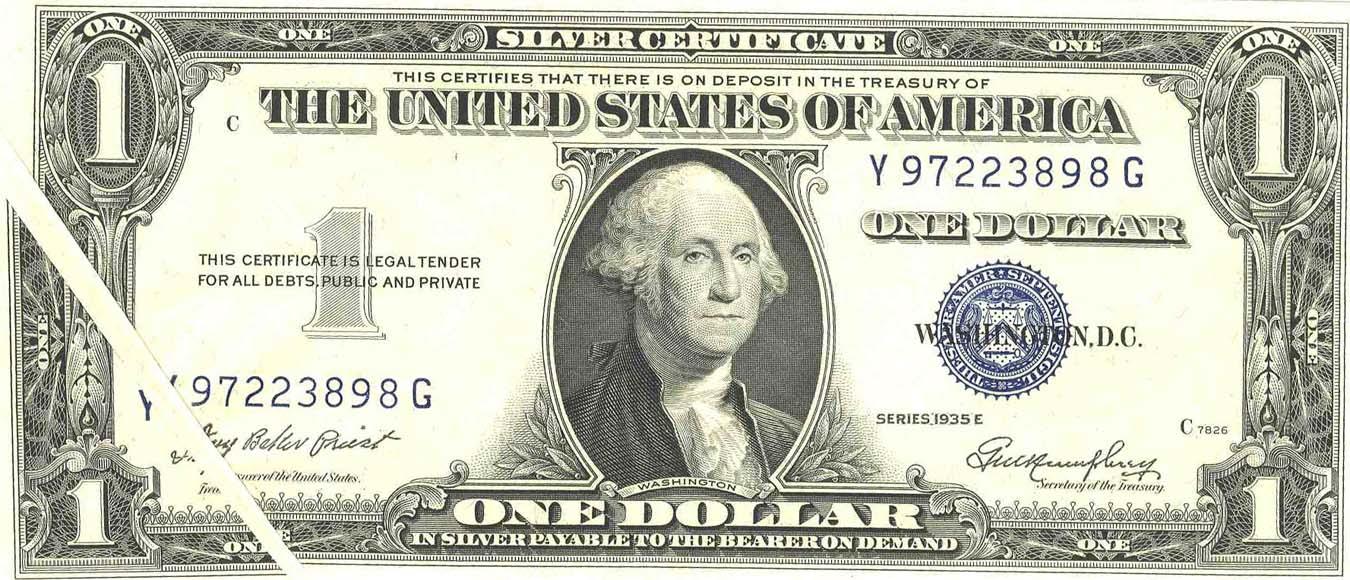 $1 Silver Certificate Error Note -- Series 1935-E, Washington -- Gutter Fold to Lower Left Corner