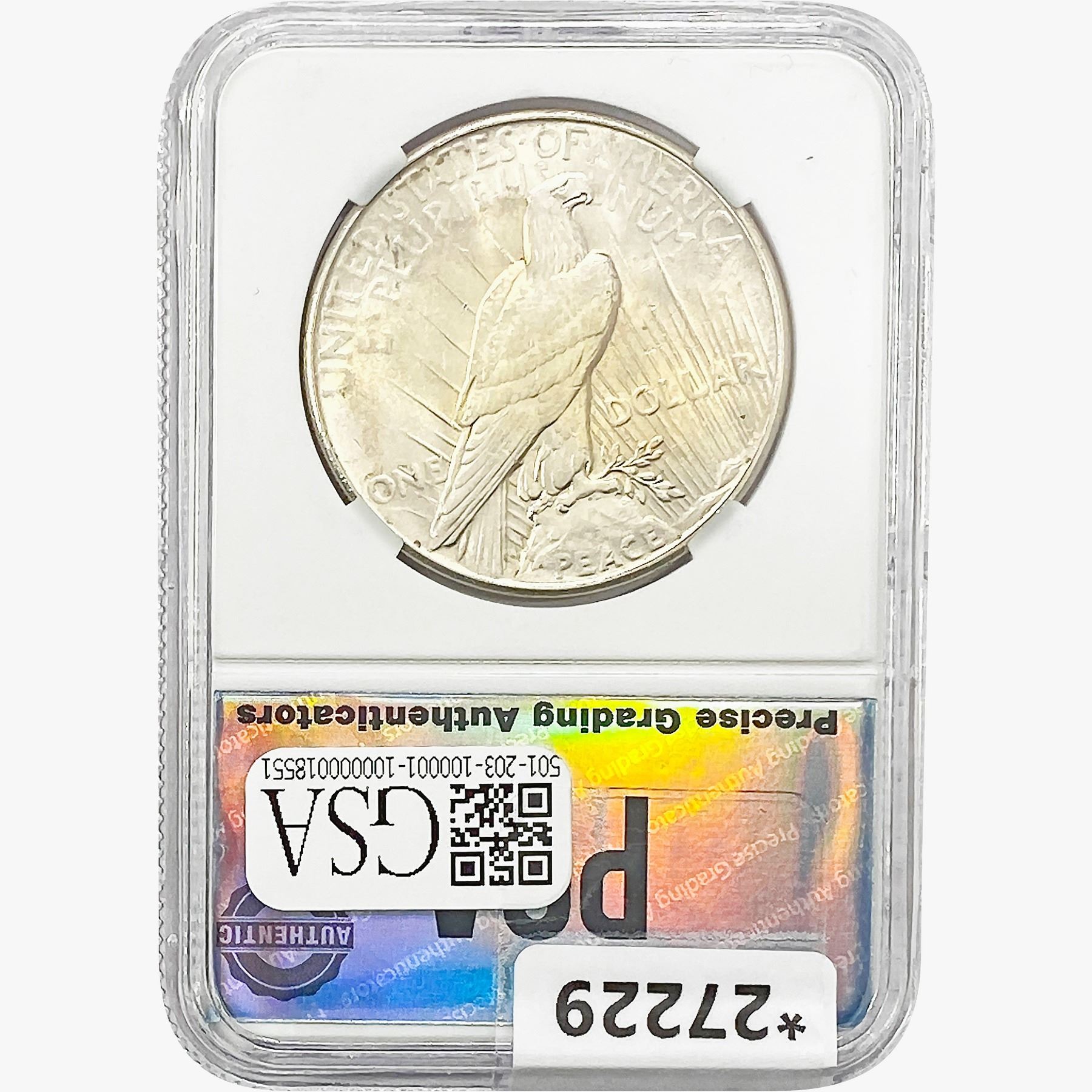 COINS AND CURRENCY LISTED IN GSA’S CATALOG AS GRADED AND ENCAPSULATED BY PCGS, NGC, ANACS, ICG, PCGS CURRENCY, PMG, PCGS BANKNOTE GRADING, CMC OR ANY OTHER THIRD-PARTY GRADING SERVICE ARE LIKEWISE SOLD “AS-IS” EXCEPT AS EXPRESSLY SET FORTH HEREIN. ALL THIRD-PARTY GRADING SERVICE GUARANTEES, INCLUDING AUTHENTICITY, ARE THE SOLE RESPONSIBILITY OF THE THIRD-PARTY GRADING SERVICE AND NOT WARRANTIES OR GUARANTEES OF GSA. BIDDERS SHOULD CONTACT THESE THIRD-PARTY GRADING SERVICES DIRECTLY WITH RESPECT TO ANY CLAIMS OR QUESTIONS THEY MAY HAVE CONCERNING THEIR GUARANTEES AND WARRANTIES. BIDDERS ACKNOWLEDGE AND AGREE THAT AUCTIONEER IS NOT BOUND BY OR LIABLE FOR ANY OPINION OR CERTIFICATION BY ANY THIRD-PARTY GRADING SERVICE. REMOVAL OF A PRODUCT FROM ITS PROTECTIVE CASING OR HOLDER OR ALTERATION OF ANY COIN HOLDER WAIVES ALL RIGHTS CONCERNING THE PRODUCT CONTAINED THEREIN.