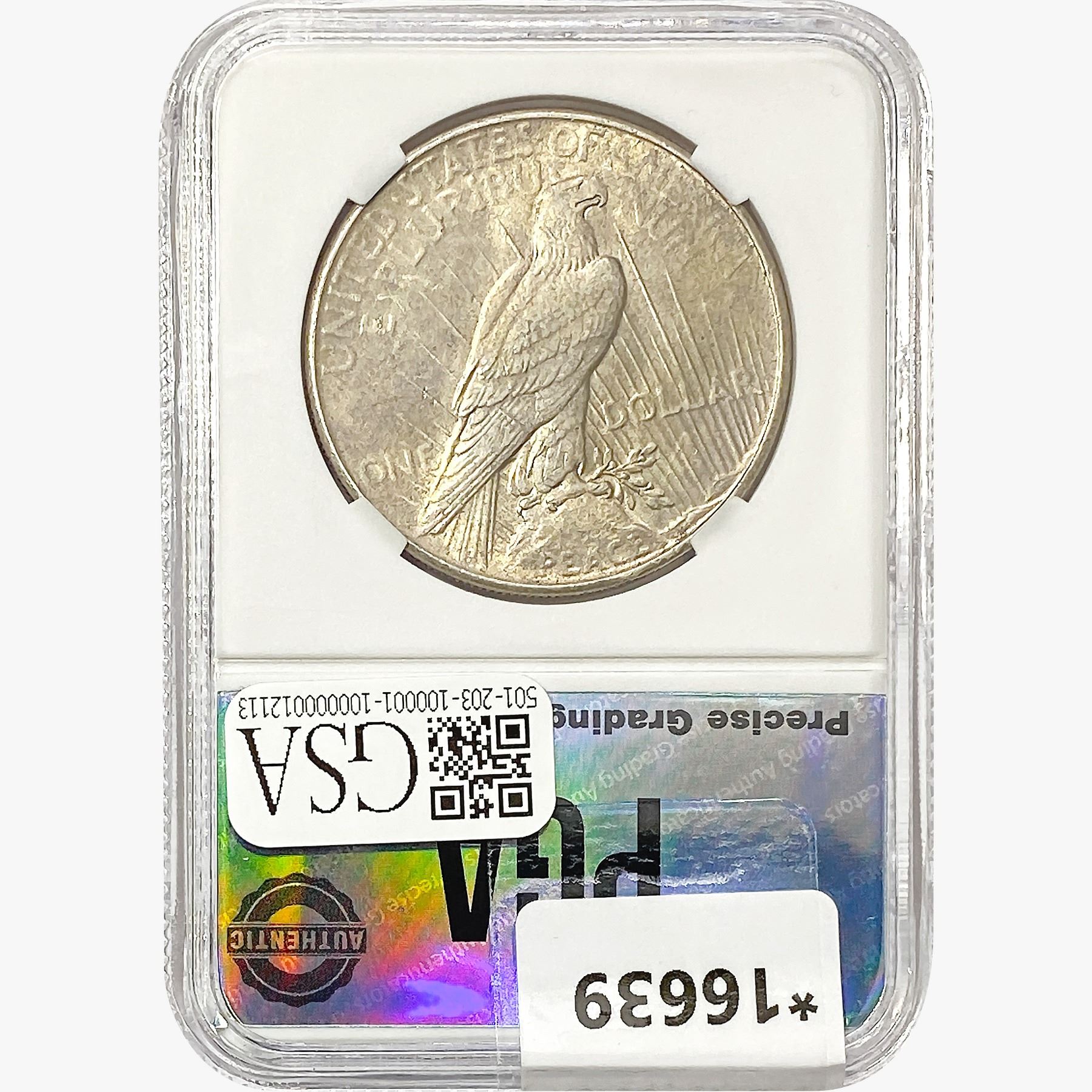l. All non-certified coins and currency are guaranteed genuine, but are not guaranteed as to grade, since grading is a matter of opinion, an art and not a science, and therefore the description rendered by GSA or any third-party grading service may not agree with the opinion of others (including trained experts), and the same expert may not grade the same item with the same grade at two different times. GSA may, but is not obligated to, express an opinion as to non-certified numismatic items, in GSA’s opinion, or by its employees’ experience and the current interpretation of the American Numismatic Association’s standards as of the date the catalog was prepared. There is no guarantee or warranty expressed or implied that the grading opinions utilized by GSA, if any, will meet the standards of any grading service at any time in the future.